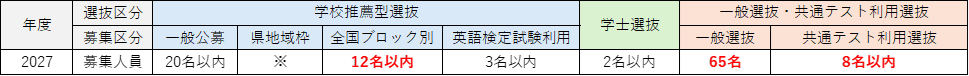 全国ブロック別学校推薦型選抜の募集人員を、これまで「北海道・東北ブロック」「関東ブロック」「中部ブロック」「近畿ブロック」「中国・四国ブロック」「九州・沖縄ブロック」の6ブロックで各ブロック1名以内としてきましたが、2027年度入学者選抜より、各ブロック2名以内に変更いたします。それに伴い、募集区分ごとの募集人員を以下の通り変更いたします。